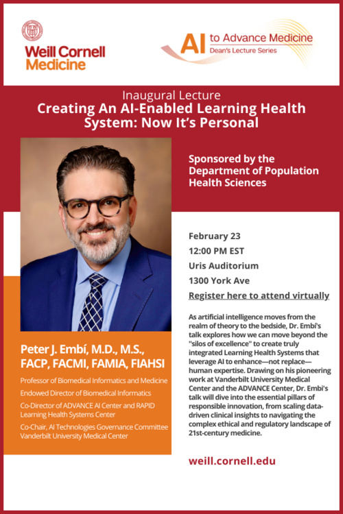 As artificial intelligence moves from the realm of theory to the bedside, Dr. Embi's talk explores how we can move beyond the "silos of excellence" to create truly integrated Learning Health Systems that leverage Al to enhance-not replace— human expertise. Drawing on his pioneering work at Vanderbilt University Medical Center and the ADVANCE Center, Dr. Embi's talk will dive into the essential pillars of responsible innovation, from scaling data-driven clinical insights to navigating the complex ethical and regulatory landscape of 21st-century medicine.