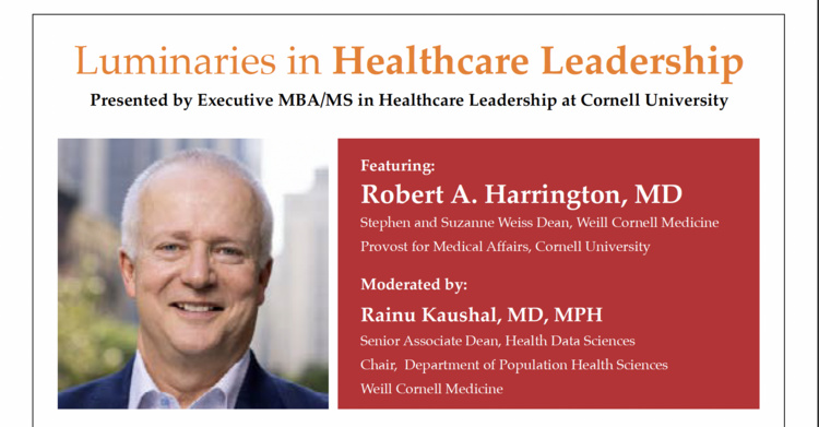 On behalf of the Executive MBA/MS in Healthcare Leadership program at Cornell University, please join us on Wednesday, October 29 from 5:30-8:00pm for our Luminaries in Healthcare Leadership fireside chat with Dean Robert A. Harrington, MD, Stephen and Suzanne Weiss Dean of Weill Cornell Medicine and Provost for Medical Affairs at Cornell University.